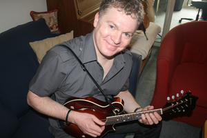 So I made the leap and bought a fairly nice instrument — an Eastman MD515. Here’s a picture of me on the day I brought the mando home: