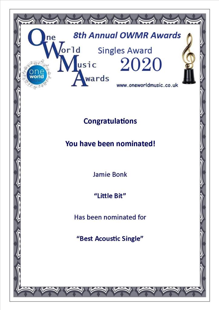 “Little Bit” – Nominated for Best Acoustic Single (8th Annual OWMR Awards) My single “Little Bit” has been nominated for Best Acoustic Single (8th Annual OWMR Awards)! Share this: Click to share on Facebook (Opens in new window) Facebook Click to share on Threads (Opens in new window) Threads Click to share on Bluesky (Opens in new window) Bluesky Like Loading... Related Author: Jamie Bonk I'm a guitarist/composer/producer and I have released seven LP's, two EP's, and eight singles of my own recordings. Just about every day you can find me in my studio writing, recording and practicing. View all posts by Jamie Bonk