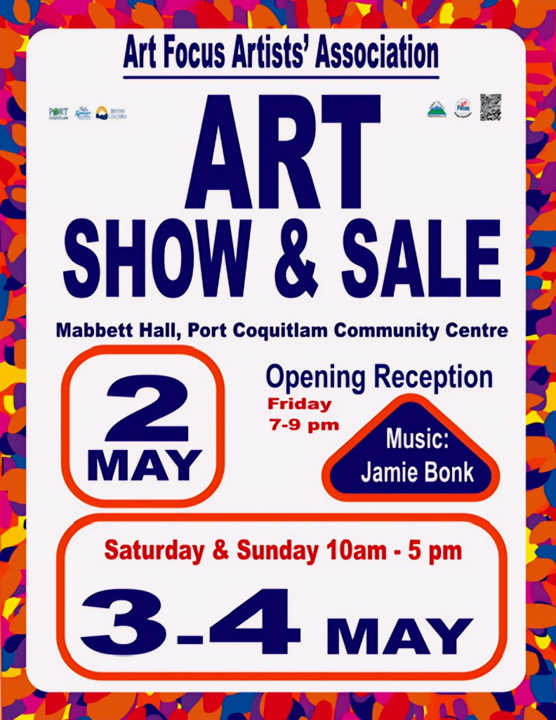 This Friday (May 2) from 7-9 PM I’m playing at the opening reception for the Art Focus Artists’ Association’s Spring Art Show & Sale. The show takes place at Mabbett Hall (Port Coquitlam Community Centre), this Friday (7-9 PM) and continues this Saturday and Sunday (10 AM – 5 PM). There’ll be lots of terrific art to check out, so if you’re free this Friday, please drop by to say hi!